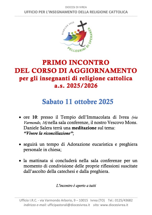 - ore 10: presso il Tempio dell’Immacolata di Ivrea (via Varmondo, 16) nella sala conferenze, il nostro Vescovo Mons. Daniele Salera terrà una meditazione sul tema: “Vivere la riconciliazione”;