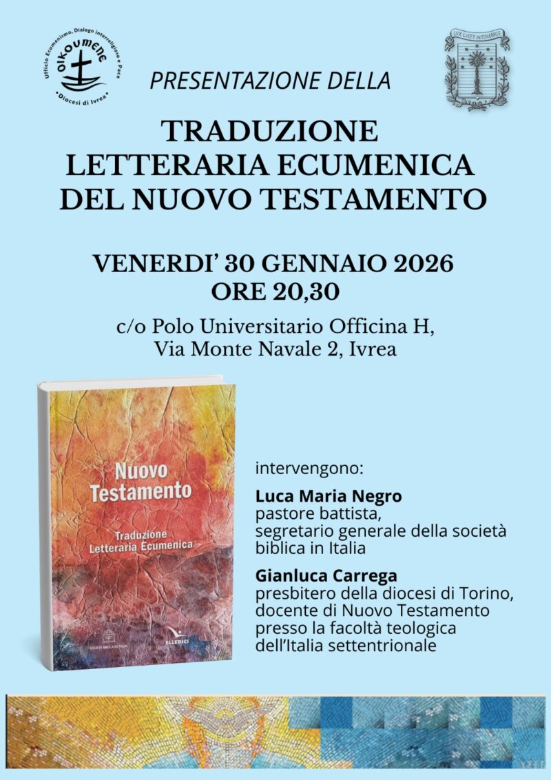 L’Ufficio per l’ecumenismo, il dialogo interreligioso e la Pace invita alla presentazione della Traduzione letteraria ecumenica del Nuovo Testamento che si terrà venerdì 30 gennaio 2026 ore 20.30 presso il Polo Universitario Officina H, via Monte Navale 2, Ivrea.