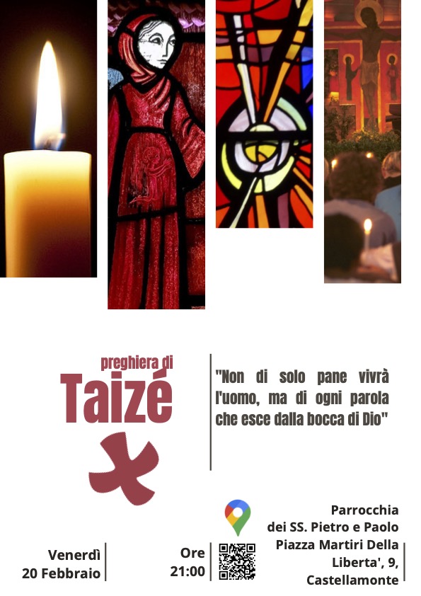 Archivio_2026, News, Ufficio Ecumenismo 7 Febbraio 2026 admindiocesi Preghiera di Taizé – Venerdì 20 febbraio “Non di solo pane vivrà l’uomo, ma di ogni parola che esce dalla bocca di Dio” Preghiera di Taizè, venerdì 20 febbraio ore 21.00. Parrocchia dei SS. Pietro e Paolo Piazza Martiri Della Liberta’, 9, Castellamonte