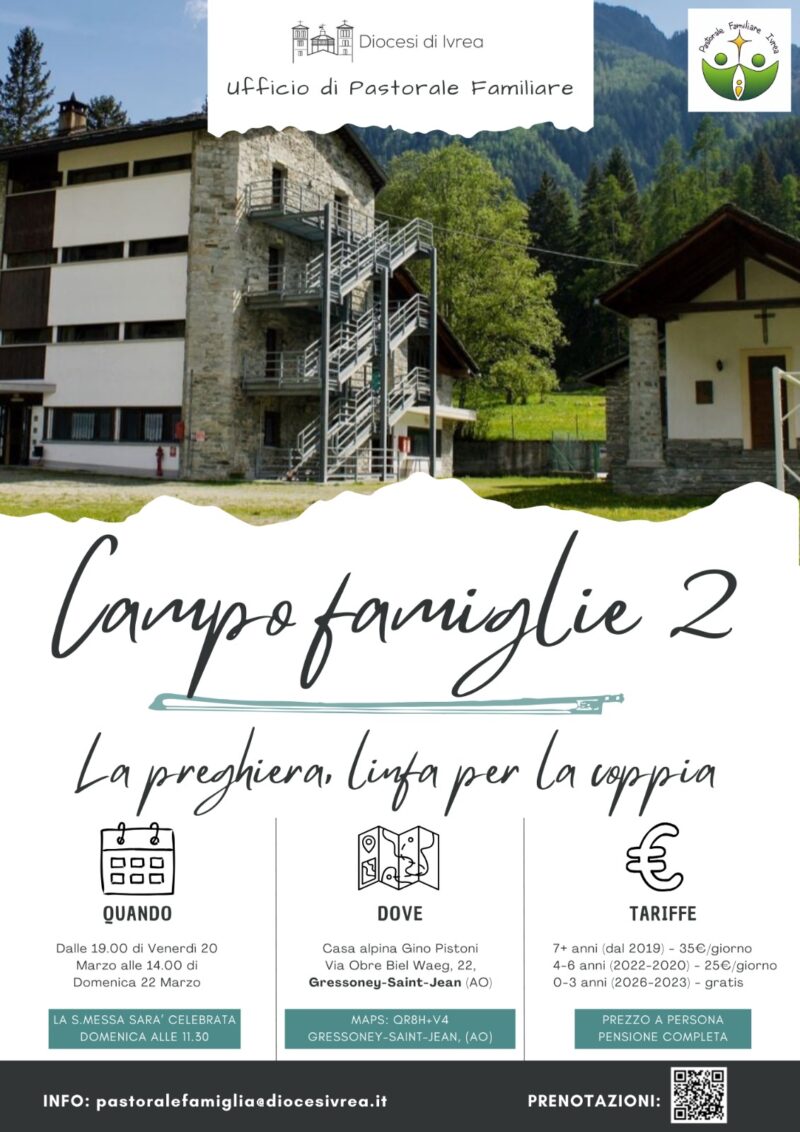 Il tema di questo campo sarà la preghiera in famiglia intesa come strumento prezioso di crescita nella fede e di perdono reciproco. Insieme al vescovo Daniele, proseguiremo il percorso iniziato a novembre, andando alla scoperta di strumenti concreti per favorire il dialogo. Ci lasceremo guidare dal “terzo componente” del matrimonio cristiano: l’amore di Gesù Cristo.