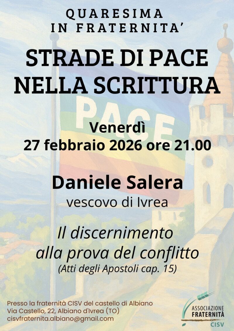 La fraternità CISV del castello di Albiano invita alla meditazione “Il discernimento alla prova del conflitto” (At 15) tenuta dal vescovo Daniele Salera, vescovo di Ivrea, nell’ambito della Quaresima di fraternità “Strade di Pace nella Scrittura”.