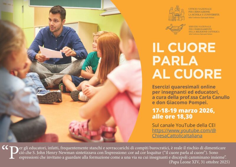 “Il cuore parla al cuore” è il tema scelto per la terza edizione degli esercizi quaresimali online per educatori e insegnanti che l’Ufficio Nazionale per l’educazione, la scuola e l’università e il Servizio Nazionale per l’IRC propongono dopo l’ampia partecipazione degli scorsi anni. Gli “esercizi” consistono in tre video e alcune schede con spunti di riflessione e azione.