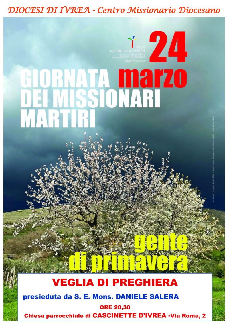 Il Centro Missionario Diocesano di Ivrea invita alla veglia di preghiera che si svolgerà il 24 marzo 2026 presso la Chiesa parrocchiale di Cascinette di Ivrea (Via Roma 2). La veglia sarà presieduta dal mons. Daniele Salera.