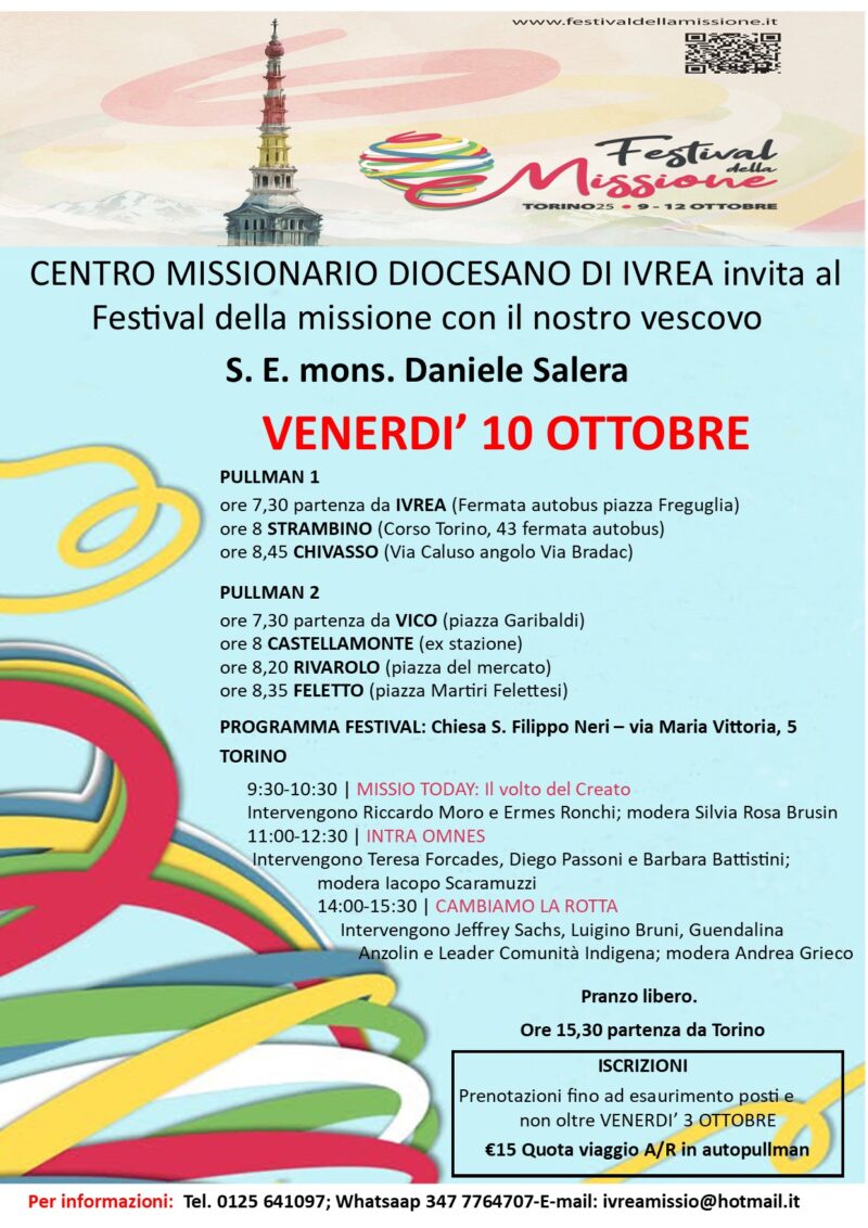 Sarebbe importante leggere con calma il programma divulgato e fare un pensierino per visitare e ricevere spunti per il nostro cammino futuro. A volte ci chiediamo se le missioni in terre lontane sono ancora possibili e se questo porterà ossigeno a noi che abbiamo avuto tradizioni importanti. Credo che nei tanti argomenti che il Festival amplierà ci siano tante risposte. Con il nostro Vescovo mons. Daniele saremo presenti venerdì 10 ottobre. Vorremmo organizzare questa giornata insieme alle Parrocchie e alle persone che sono sensibili ai tanti aspetti della vita umana e missionaria. In pratica abbiamo preparato un viaggio verso Torino con due pullman che dalla Diocesi di Ivrea passeranno a raccoglierci e ci condurranno dentro al programma della giornata. Come potete osservare sul programma del venerdì ci sono interessi e attività da corrispondere. Partiremo da Ivrea (ore 7.30) per raggiungere Strambino, Chivasso e proseguire verso Torino. Partiremo anche da Vico, (ore 7.30) per raggiungere Castellamonte, Rivarolo, Feletto, e via verso il Festival della missione. Il cuore è pronto! Tante sorprese belle e fruttuose ci attendono. Per tutti l’invito è lanciato vi aspettiamo numerosi.
