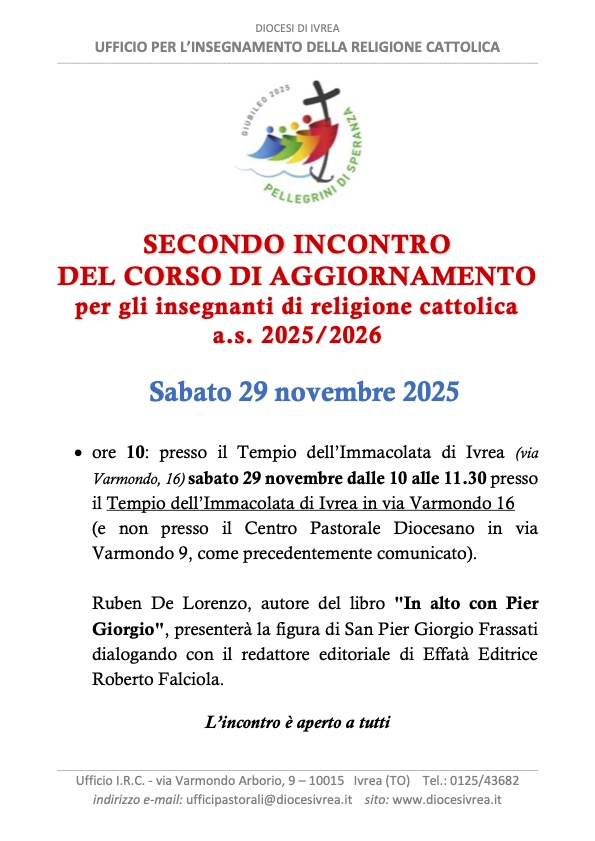 Secondo incontro del corso di aggiornamento per gli IdR – 29 novembre 2025Il secondo incontro del corso di aggiornamento per gli IdR si svolgerà sabato 29 novembre dalle 10 alle 11.30 presso il Tempio dell’Immacolata di Ivrea in via Varmondo 16 (e non presso il Centro Pastorale Diocesano in via Varmondo 9, come precedentemente comunicato). Interverrà Ruben De Lorenzo, autore del libro “In alto con Pier Giorgio”, presenterà la figura di San Pier Giorgio Frassati dialogando con il redattore editoriale di Effatà Editrice Roberto Falciola. Read More |