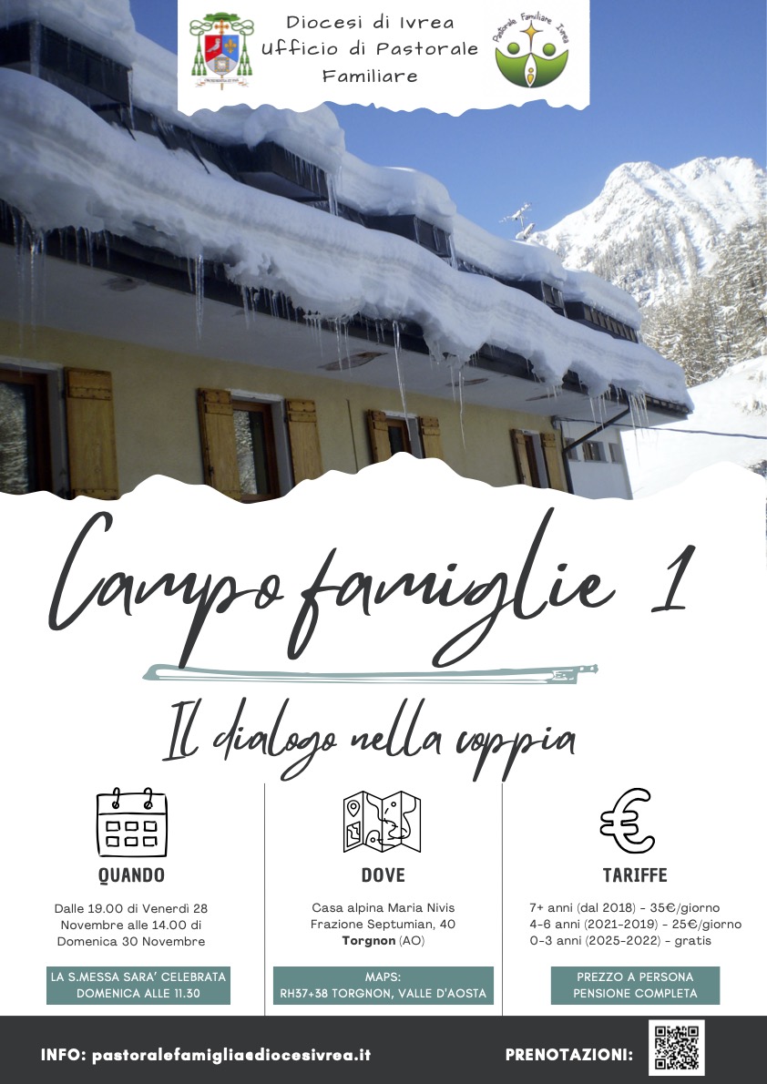 Campo famiglie 1. Il dialogo nella coppia. 28-30 NovembreDal 28 al 30 novembre, presso la casa alpina Maria Nivis di Torgnon, si terrà il primo dei 2 campi famiglie diocesani organizzati dall’ufficio di pastorale familiare. Il tema del campo sarà il dialogo nella coppia. Insieme al vescovo Daniele considereremo come la coppia possa disporsi ad un dialogo aperto e sincero che permetta di crescere insieme e al contempo consolidare quelle promesse fatte il giorno del matrimonio, che portano gli sposi a riconoscersi come unità con le… Read More |