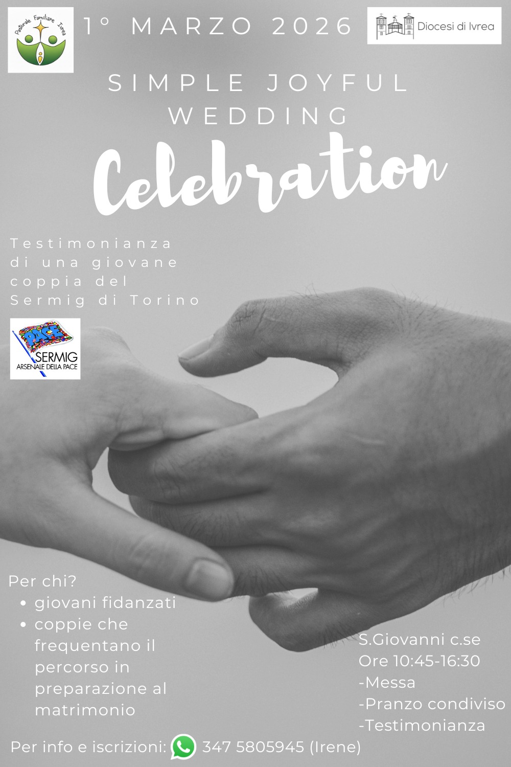 Festa dei Fidanzati 2026: La Bellezza della SemplicitàL’Ufficio di Pastorale Familiare diocesana vi invita domenica 1° marzo a San Giovanni Canavese per una giornata di condivisione sulla scelta del matrimonio cristiano. L’incontro è aperto a tutte le coppie: sia a chi sta frequentando (o ha già concluso) il percorso di preparazione, sia ai giovani fidanzati che desiderano semplicemente avvicinarsi a questa realtà. Il programma della giornata: Ore 10.45: Ritrovo presso la Chiesa Parrocchiale di San Giovanni Canavese. Ore 11.00: Santa Messa comunitaria. Read More |