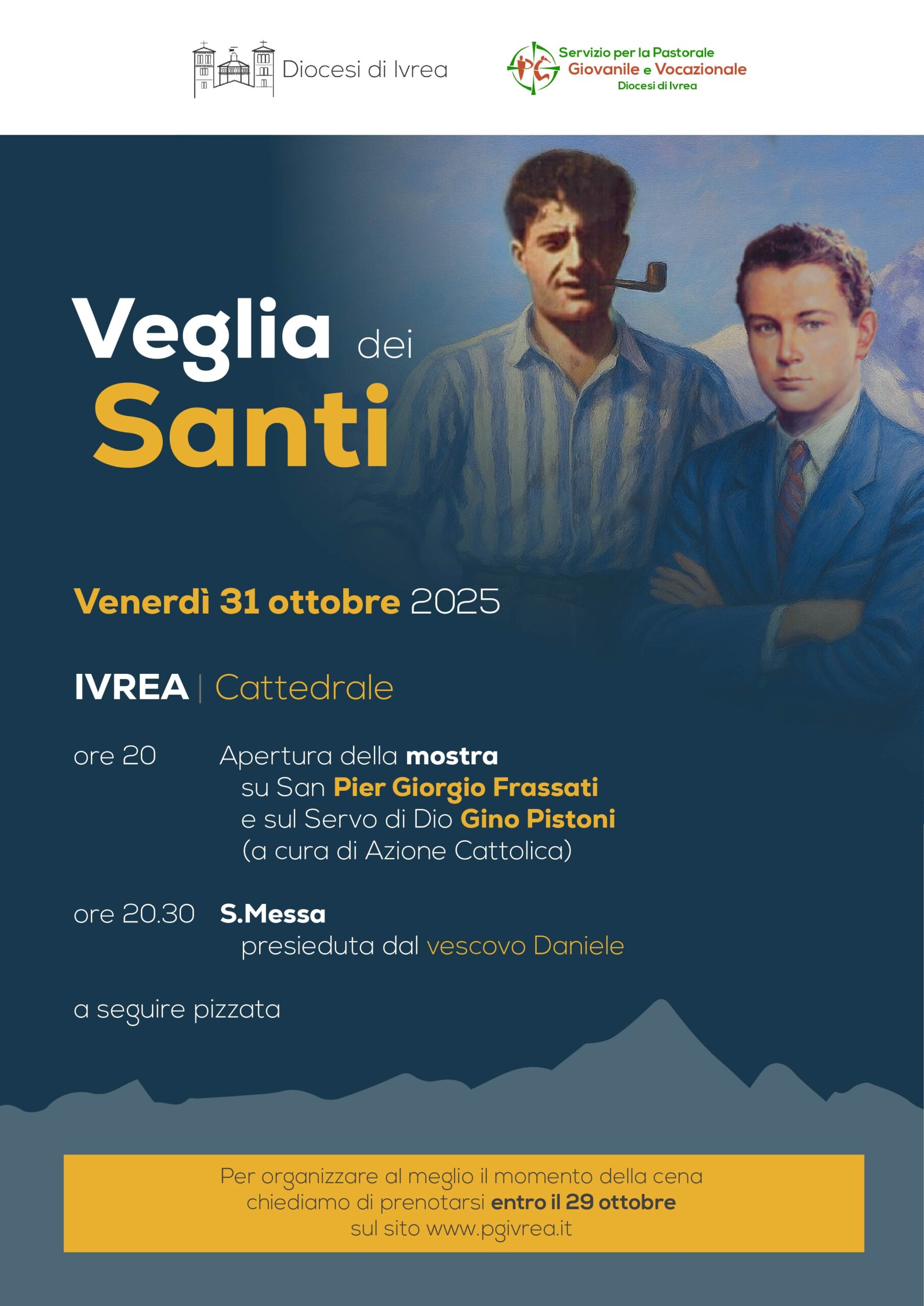 Veglia dei Santi – 31 ottobre 2025IVREA | Cattedrale ore 20 Apertura della mostra su San Pier Giorgio Frassati e sul Servo di Dio Gino Pistoni (a cura di Azione Cattolica) ore 20.30 Santa Messa presieduta dal vescovo Daniele a seguire pizzata Per organizzare al meglio il momento della cena chiediamo di prenotarsi entro il 29 ottobre sul sito www.pgivrea.it Locandina Veglia dei Santi… Read More |