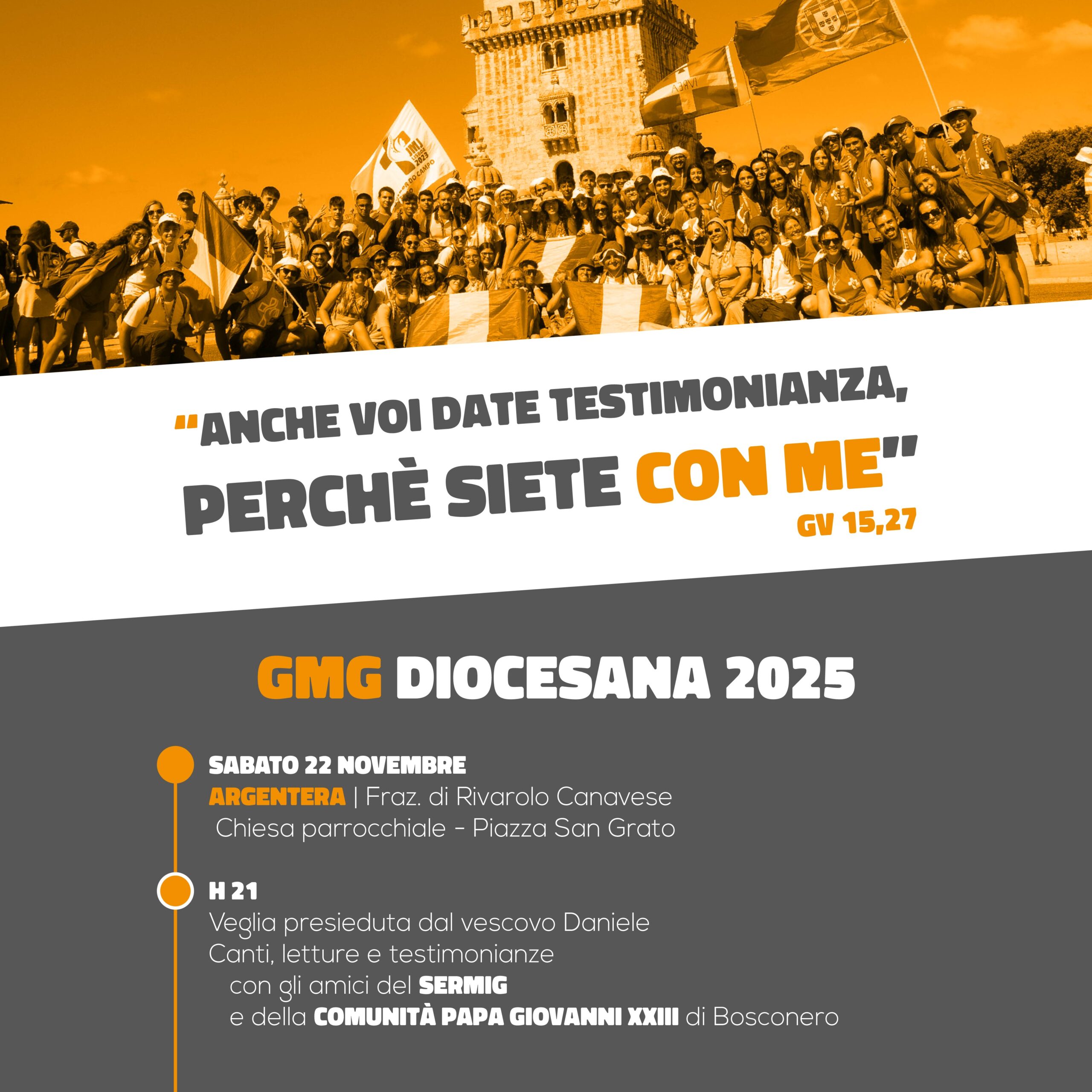 GMG diocesana – veglia di preghiera. 22 novembre 2025“Anche voi date testimonianza, perché siete con me” (Gv 15,27). GMG diocesana e veglia di preghiera. Sabato 22 Novembre – h 21. Argentera (Rivarolo C.se) – Chiesa Parrocchiale, Piazza San Grato Presiede il vescovo Daniele con canti, letture e testimonianze insieme agli amici del SERMIG e della Comunità Papa Giovanni XXIII di Bosconero. Read More |