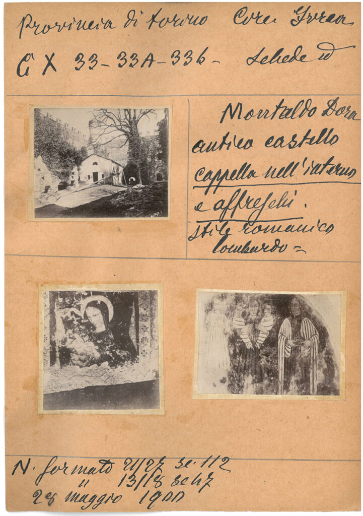 CX –33 – 33A- 33b / Schede id https://www.diocesivrea.it/wp-content/uploads/sites/2/2025/09/0023.mp3 Montalto Dora Antico castello Cappella nell’interno e affreschi Stile romanico lombardo. N. formato 21/27 scatola 112 N. formato 13/18 scatola 47 28 maggio 1900