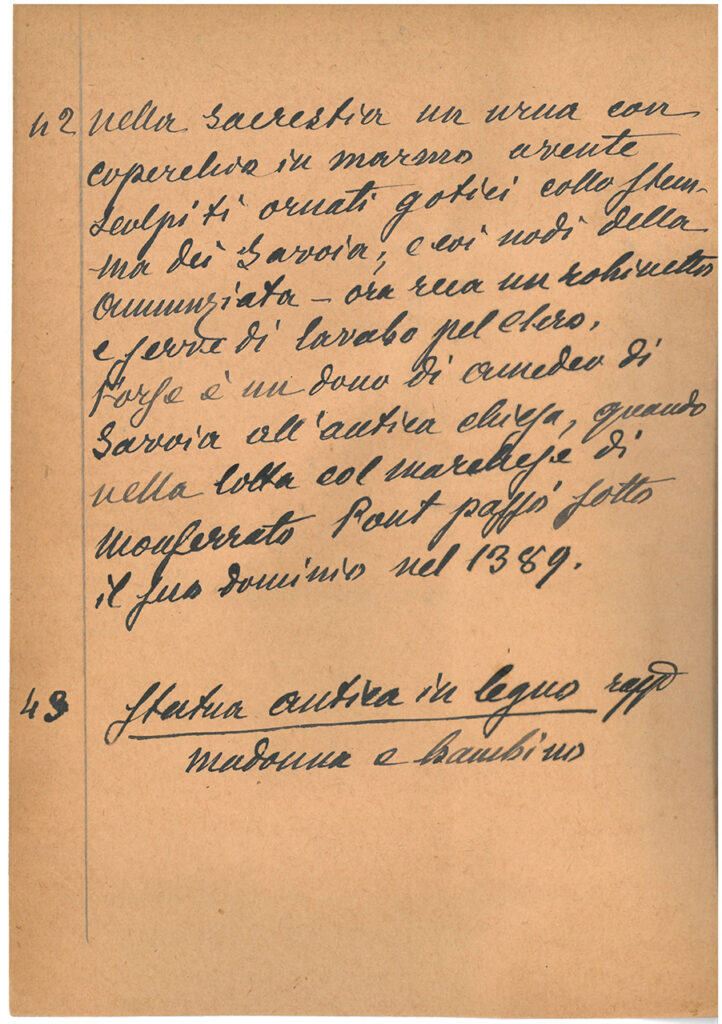 42 nella sacrestia un urna con coperchio in marmo avente scolpiti ornati gotici collo stemma dei Savoia, e coi nodi della Annunziata. Ora reca un robinetto e serve da lavabo pel clero.