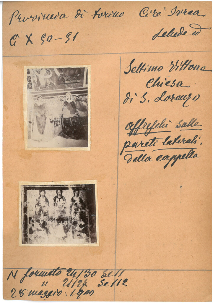 CX –47 – 48 – 49 / Schede id https://www.diocesivrea.it/wp-content/uploads/sites/2/2025/09/0032.mp3 Settimo Vittone Chiesa di S. Lorenzo Affreschi sulle pareti laterali della cappella N formato 24/30 scatola 11 N formato 21/27 scatola 112 28 maggio 1900